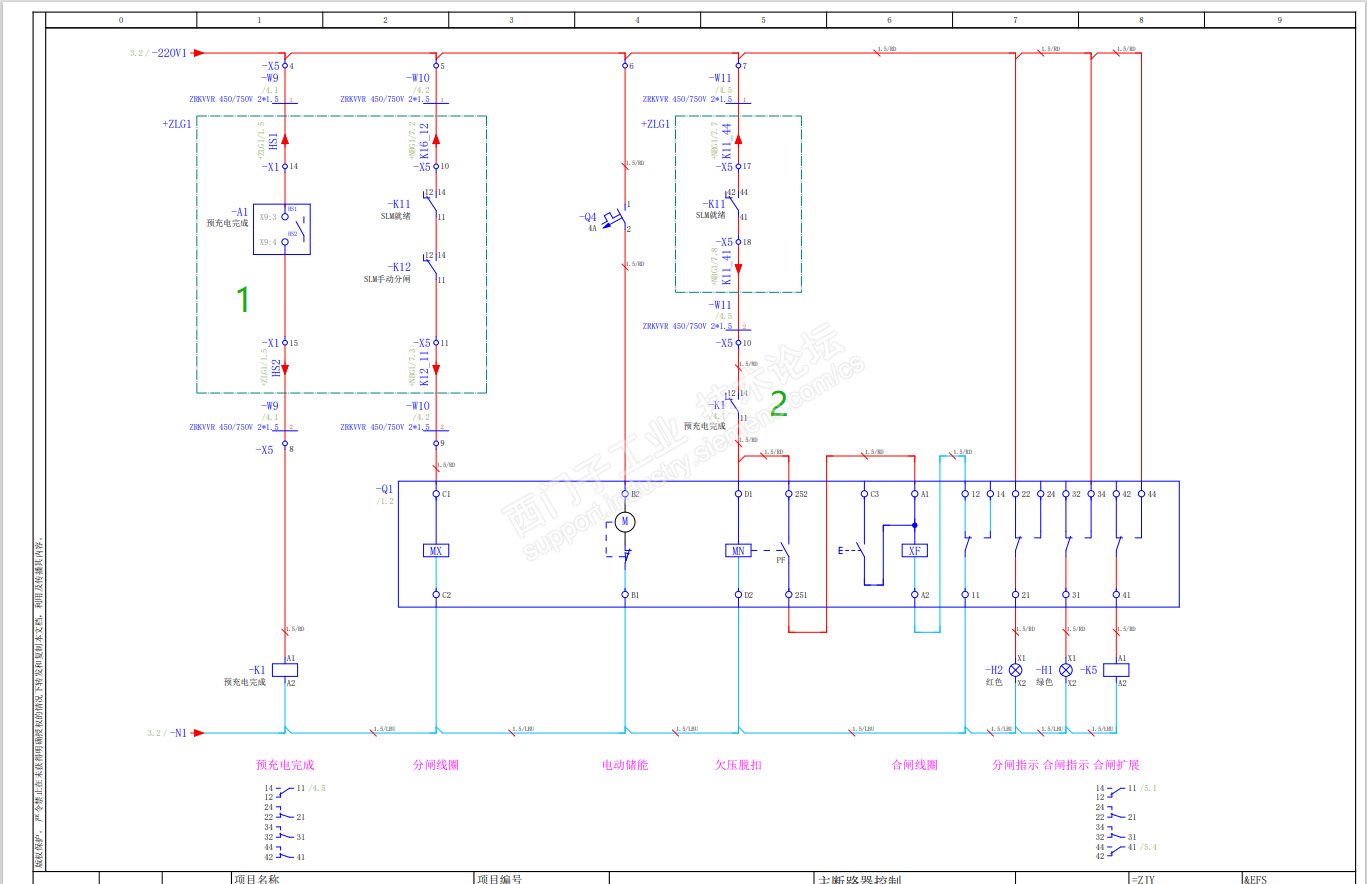 2、在任何情况下,均不允许在完成预充电之前闭合主断路器,尤其禁止操作人员手动合断路器。因此将预充电完成节点串接至断路器欠压回路,这样只要预充电完成信号没来不管是电动还是手动操作均不能合闸。