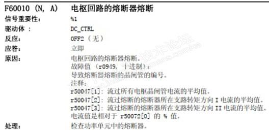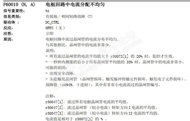 6RA80互感器故障导致F60010 产品类别: 产品型号(MLFB):6RA8087-6DS22-0AA0 序列号(Serial No.): ZYKN0368000060 故障情况描述/ Fault Des cription: F60010 故障代码:F60091,F60092,F60036(故障值=11/13) 1.外观检查 电枢回路测量正常,励磁回路测量正常。 1)故障机一上控制电就报F60091,F60092故障----参考电压P10/N10超出公差。 从2 本不同版本的6RA80 参数手册上检索到的F60010 这个故障,有不同的解释,因着 在STARTER 软件中对F60010 的英文解释是“the current in the armature is uneven distribution”,第一张图片的解析更贴切一点。 从参数手册中对故障的描述,并结合装置本身没有配置电枢回路熔断器来分析,应该是 电枢回路在电机运转在≥200 转时,输入电流某相可能突然没有了。以下4 图是对 F60010 这个故障相关的参数测得的数据。