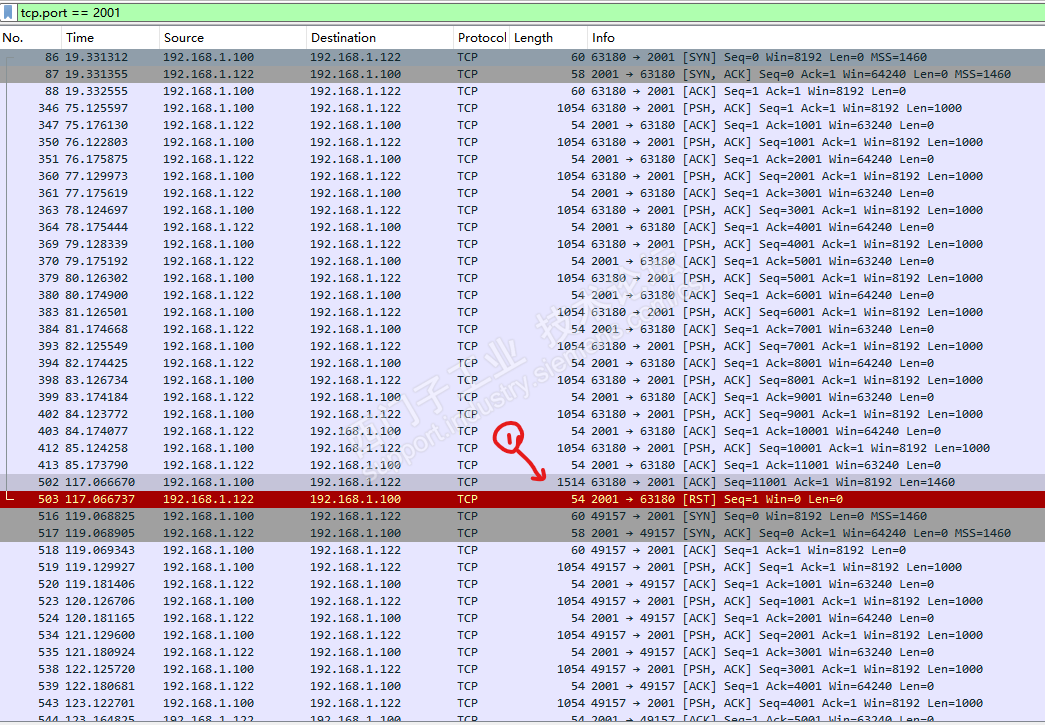 WireShack捕获如图 PC端WireShack抓包如图 上图1处为插入网线后PC端接收到的第一条数据,随后PC端TCP服务器主动断开,2秒后PLC侧主动重连。在第一次建立连接到网线断开处,可看出共收到11条数据。 疑问: 1500的StackBuffer共8192个字节,如上,网线断开后共有19-11=8条数据存入了StackBuffer中,若仅计算数据长度,则在这个期间内共有8*1000=8000字节数据存入StackBuffer中,若根据StackBuffer处于OSI参考模型的第4层,数据压入到StackBuffer中时带有TCP头部信息,则每条数据实际长度为1000+20=1020字节,则在这期间共有8*1020=8160字节数据压入到StackBuffer中。虽然两者的结果均可导致第17次发送时,ShadowBuffer中的1000字节数据无法压入StackBuffer中,导致Busy常为1。 另外为何断开网线 重新插入后,PC端接收到的第一条数据长度是1460字节?ShadowBuffer满通讯正常后,发送长度为何不按发送端发送的长度发送,而是以最大长度发送? 又为何服务器端会主动复位连接? PLC是否是固定在连接异常后2秒重连?