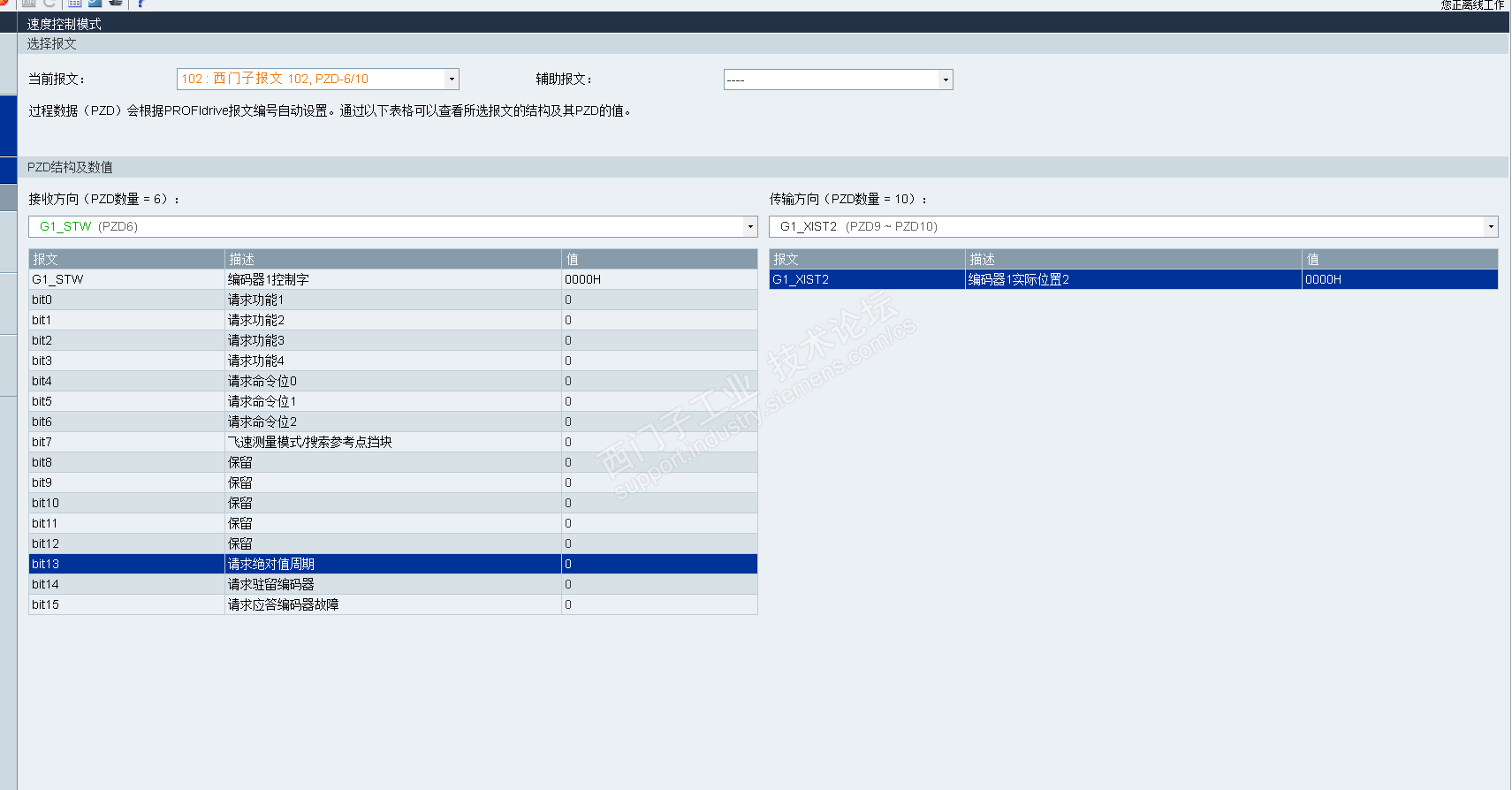 主题:回复:V90多圈绝对值编码器在重启后R482位置丢失r482是“第二个编码器数值”,也就是“绝对值编码器数值” 先来看看102报文,关于编码器控制字各个位的定义: 也就是说,如果需要启用“绝对值编码器位置”,在V90驱动器总线接通后,对编码器控制字的bit13发出“请求绝对值周期”的命令16#2000,PZD9-PZD10才会将绝对值编码器位置信息返回到控制器。 关于这个问题,我之前发出过求助帖,没找到答案,大概很少有人这样去使用它。 102报文的灵活性,就是它虽然是“速度控制模式”,但可以通过“控制字1”的bit14切换到“转矩控制模式”,又能利用返回的绝对值编码器在plc侧做“位置环控制”。 至于转矩限幅功能,你完全不必使用附加报文750,甚至不必切换到转矩控制模式去,直接用“MOMED”转矩减少控制: 这个使用方法,论坛一搜就一大把的资料了! 总之,102报文本身就具备750报文限幅的功能。你这样组合使用反而是低效的,一是额外增加了总线通信字节数量;二是还得设置750报文的最大最小值,忘了这一步可能转不起来哦。
