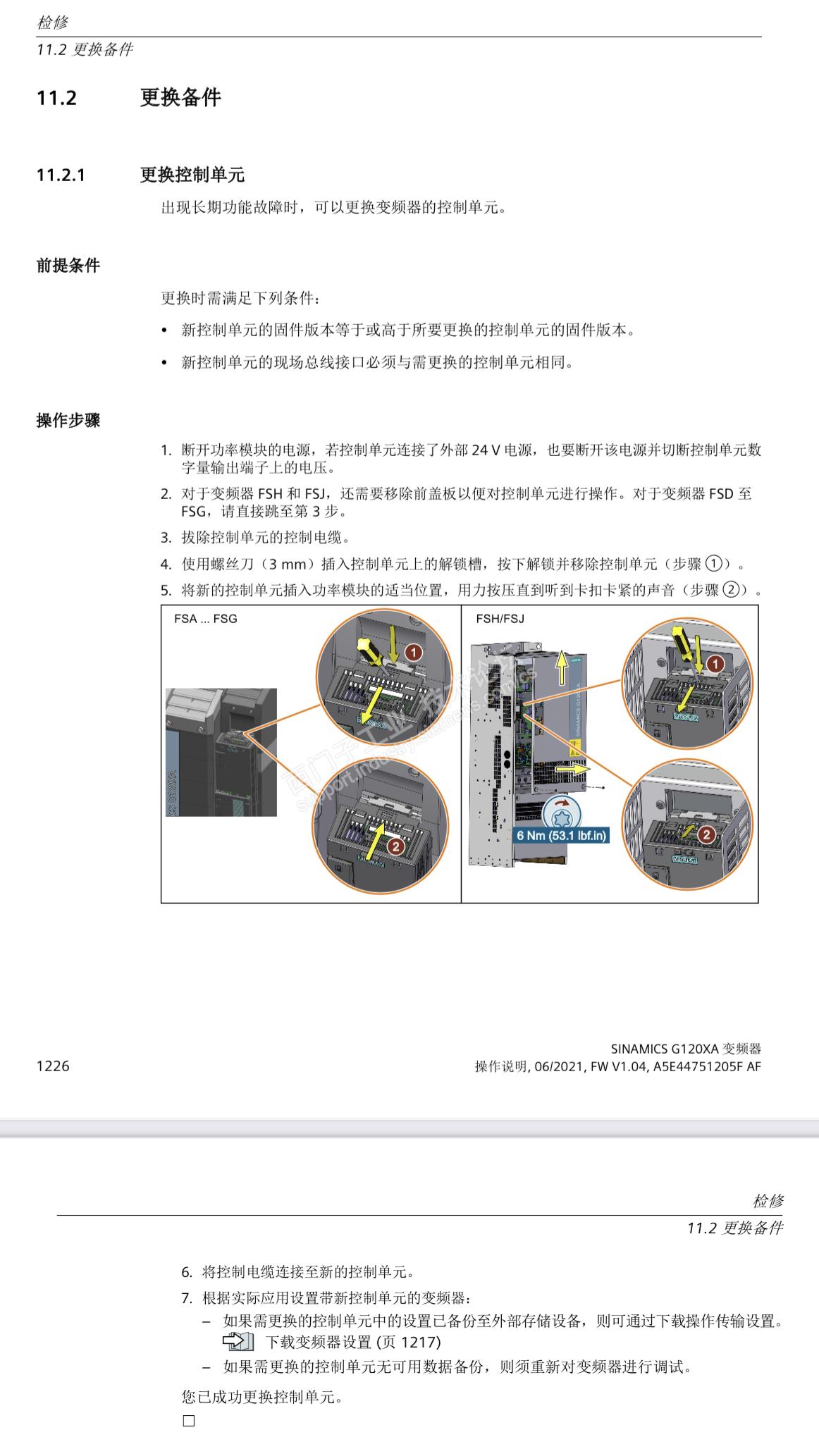 主题:回复:G120XA变频器拆卸控制单元一般在设备手册中含有介绍的,你就大胆的去做, 没有介绍的需要自己动动脑筋,可以先找个备件研究或者损坏的备件上面练练手,有时候有些卡扣什么的可能不小心就损坏了,所以,先想好影不影响停机时间,