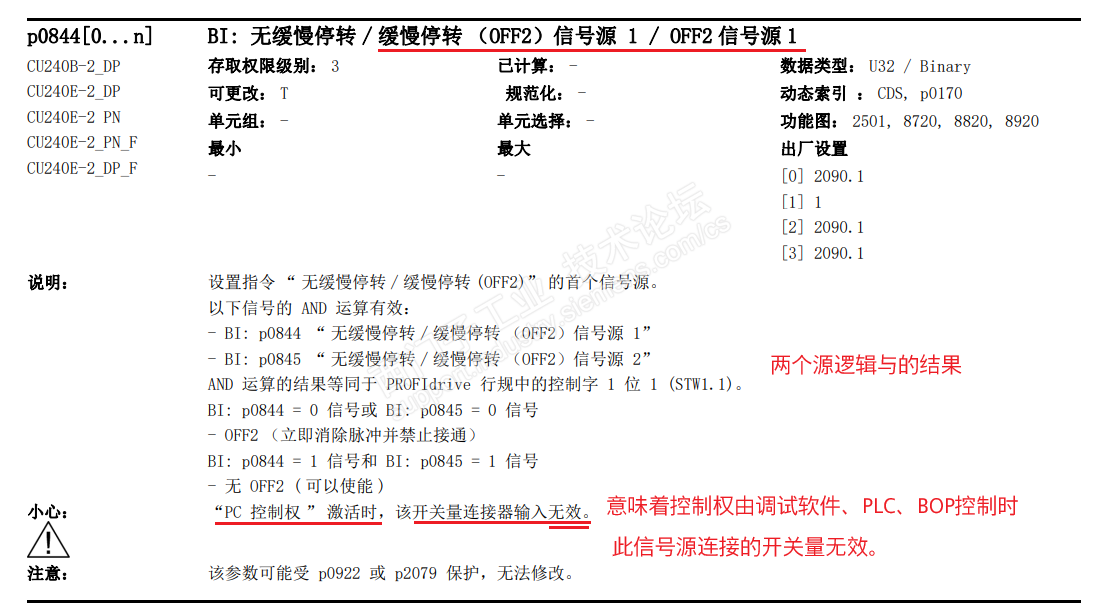 主题:回复:G120如何实现OFF1和OFF2两种停车这两个OFF2的信号源是有差别的。 在使用调试软件 STARTER、PLC(控制字1.10)、BOP操作时,P844和P845作用不一样。 源1连接的开关量无效。这样可以激活转移控制权,不管开关量状态,可调试运转。 控制源2若为0,设备不能启动,即便控制权已经转移给PC。