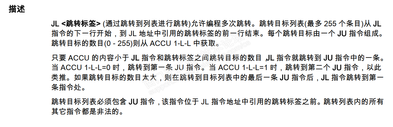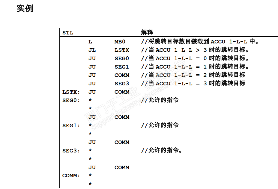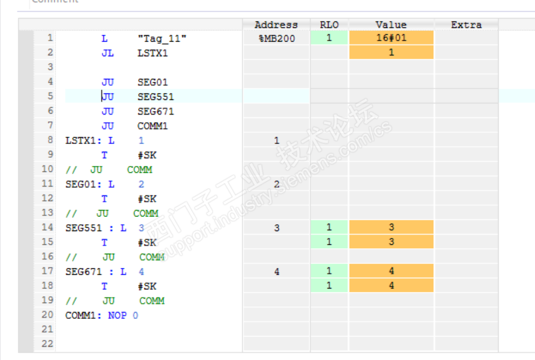 一般情况下,JU 和 JC 是最常见的跳转指令;但有时会用到JL 指令,JL 说起来更像是一组指令,类似C,C# 语言中的 switch case 语句,但是有个明显的不同,前者的判断条件可以是任意合理数字,后者范围限制在0-255,并且必须从零开始算;相同点是都会执行匹配条件剩下的全部语句,这点跟TIA 的 case 语法是不一样的; 下面是官方的描述和例子: 测试1: 可以看到,条件是1 的时候,执行的是1 和2;所以有时为了避免执行2种情况,就会加一个跳转到末尾,类似break; 根据Ju 的数目x (4),假设输入的条件是y; 如果Y 大于2 执行第一个JU, 等于0 第二个; 等于1 第三个; 等于2 第四个; 这样就理清楚了; 如果JU 的条目没有和标签数量一致会不会有问题? 少了标签会报语法错误的,相当于跳转的位置不存在,多了标签就当成普通语句就好;所以大多数情况下,这个JL ,JU 组合,跳转指令和标签是对应的;