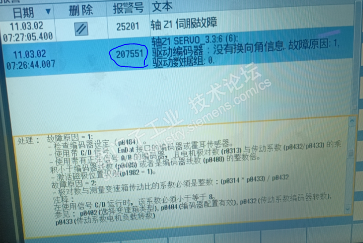 主题:龙门改造用828D系统,电机用840D的电机配置结束后机器工作正常,第二天重起后出现207995报警