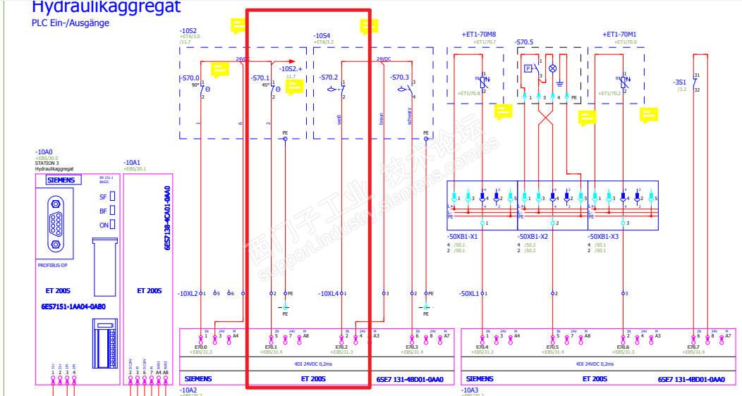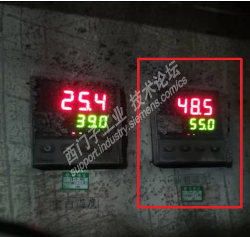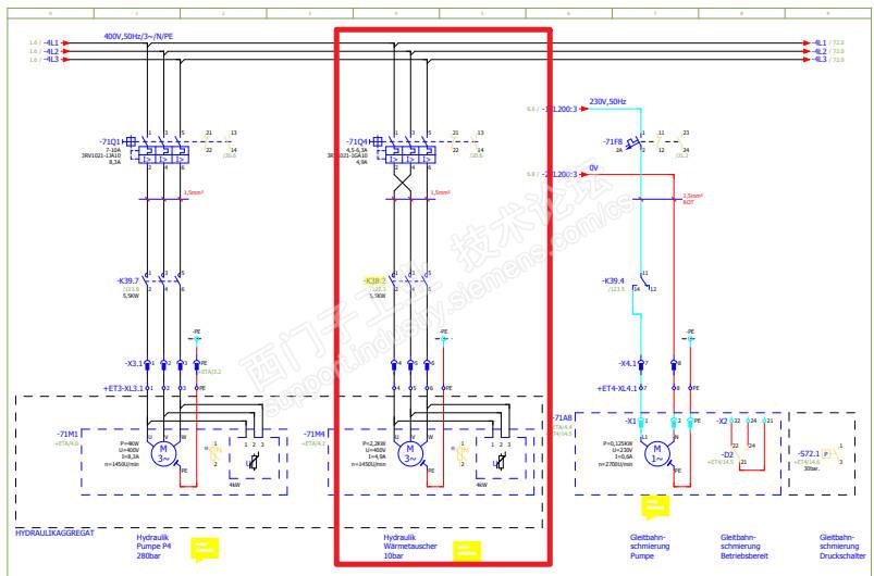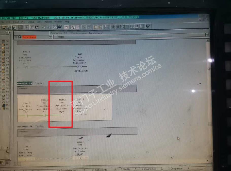 主题:一起疑似“问题的”排查过程 一起疑似“问题的”排查过程 今天上午巡检过程中,偶然发现某设备液压站冷却电机居然不转动,是在检查电机与冷却泵头之间的联轴节没有转动时发现的,回想起近期该设备总是发现液压站冷却功能下降,疑似液压站冷却器(板式换热器)脏堵原因,工厂总冷却泵稍一停止运行,该设备很快会触发液压站油温高(大于90摄氏度)的超温报警。 检查发现已经停止转动的冷却泵图示: 有时候查找故障根源也是需要“碰“运气的,难到这次也是?马上打开笔记本,先查找I/O关联。关联这个泵启停的控制,图示: 主控回路由-70Q4断路器,和-K38.2的交流接触器组成,返回到控制柜查看这些电气元器件,发现断路器未动作,交流接触器也未动作,排除了过电流和冷却泵机械方面引起的故障可能。继续查看PLC控制程序,看Q38.2的控制回路有那些控制器件组成,图示: 构成冷却泵输出的是有3个条件组成,其中,系统启动完成(I34.7)和液位低检测(I70.2)信号均正常,异常信号是Q70.1。而引起Q70.1线圈工作异常的是输入信号I70.1,这个信号确认是液压站油温低信号检测输入(上图红框程序段的下方有具体程序段),从电气原理图上看是液压站油温低于45摄氏度时,关闭冷却泵系统运行,图示: 马上到液压站确认,用手摸液压站油箱外壳,发现油温是温热感觉,未发现油温异常。返回控制室门口的控制室温度和液压站温度检测,发现液压站油温在45摄氏度附近,难怪此时冷却泵会停止运行,图示: 控制原理理顺了,原来是虚惊一场,是这个油温输入信号控件在作怪啊,不查不知道,一查真相知道了,站在温控表附近看,温度在变化,再次到这台冷却泵联轴节处看,电机有启动和停止的温控过程,说明控制正常。排查过程纠正了开始的“误判”,感觉这是一次最基本的设备排障过程,值得初级入门者参考,特写一贴。