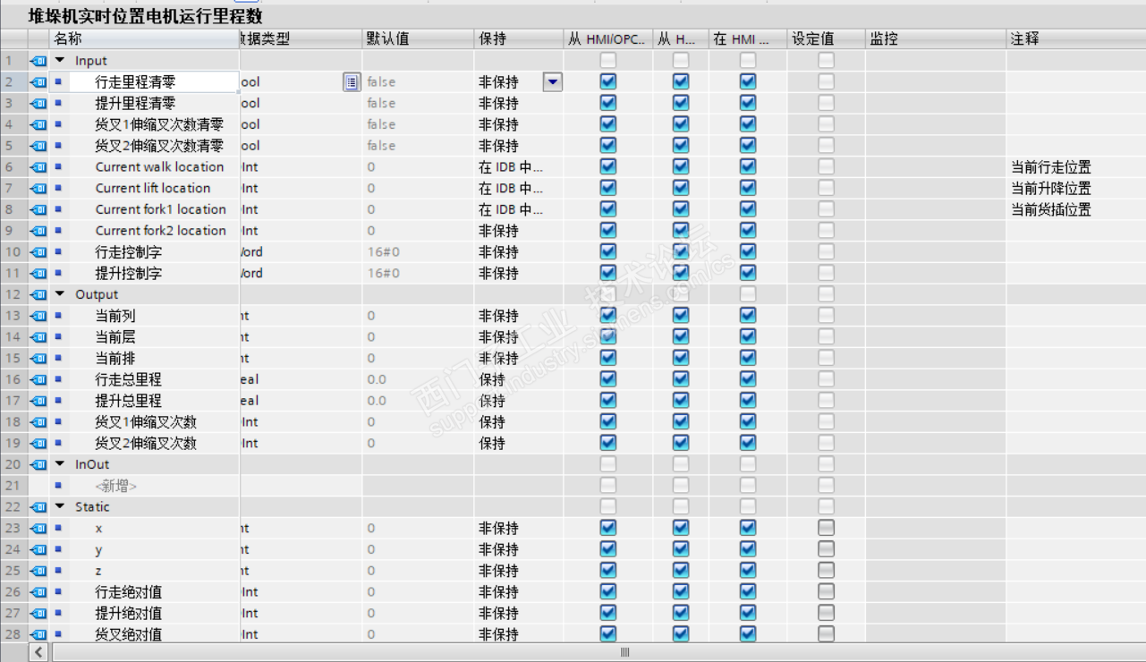 主题:【SCL编程案例】-电机行走里程计数案例分享 这是一个堆垛机电机行走记录总里程的程序,当电机控制字为047E时,表明电机处于空闲状态。如果是电机刚从行驶状态变为停止状态,那么行走添加标志变为1,此时需要加电机原来的里程数和行驶的里程数相加,那么就得到新的里程数。复位行走添加标志位,在电机没有行走的情况下,里程数不会再次增加。然后把当前的行走位置作为参考位置,方便下次行走时拿来比较。 当电机控制字为0C7F或者047F时,表明电机正在行走,并且不断地刷新行走差值,当控制字变为047E时,行走标志位变为1,里程数就又重新计算了。 这段程序旨在提醒客户当前电机已经运行了多少距离,并在合适的里程数时对电机进行维护。程序还有一段是对里程数清零的,假设客户已经对电机进行了维保,那么可以使用一键清零的指令对电机的里程数重新计数。 此程序已经在好多项目上使用,并且已经得到验证,证明里程计算时正确的。我之前做项目,看过人家的里程数程序,只计算了自动模式下的,手动行走的并没有纳入计算,这是不准确的。因为电机只要转动就必须记录行驶里程。这个是我自己摸索出来的,具有完全知识产权的一段程序,今天拿来与大家分享。