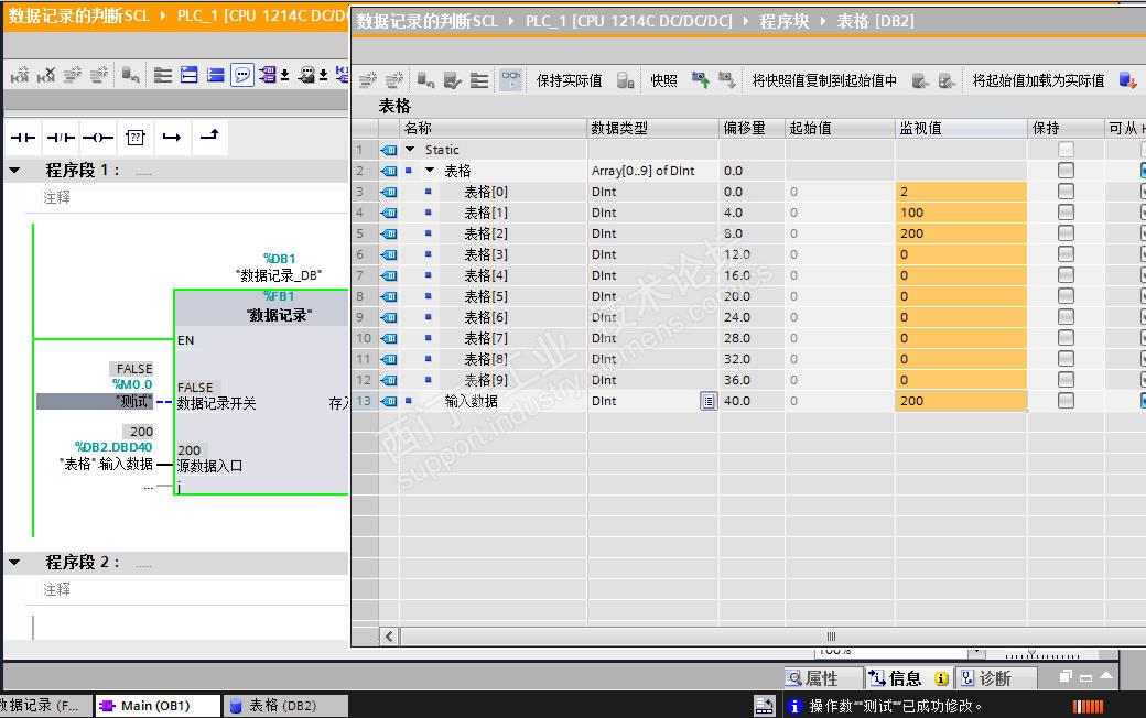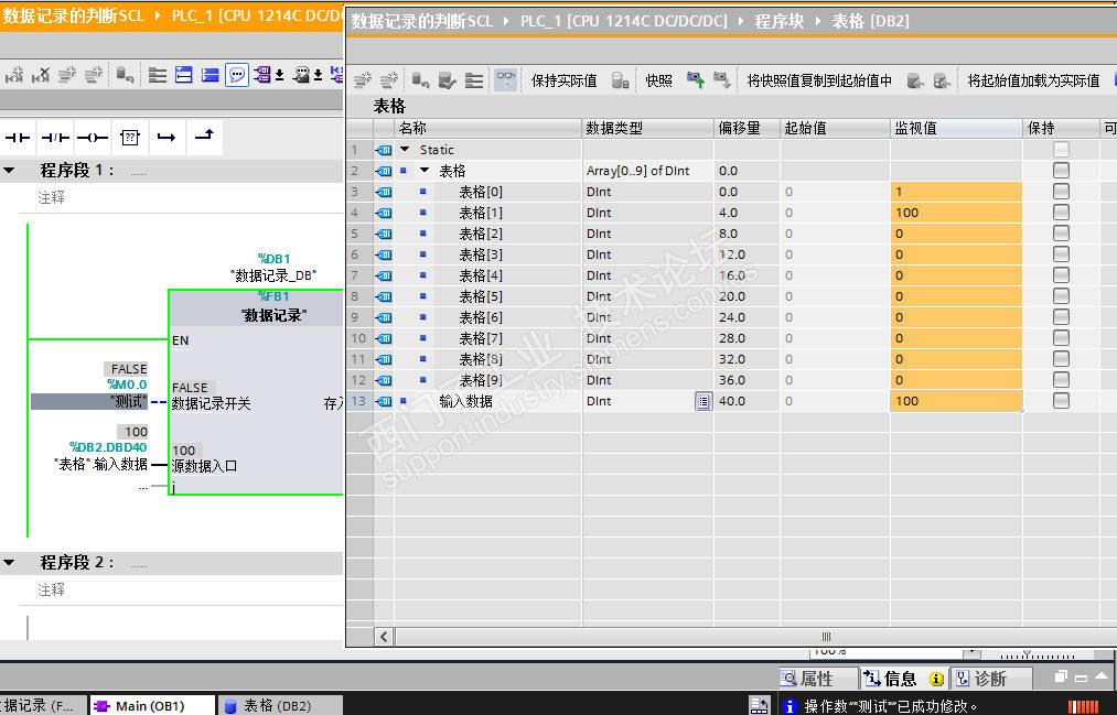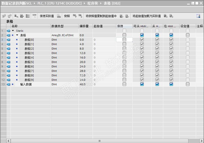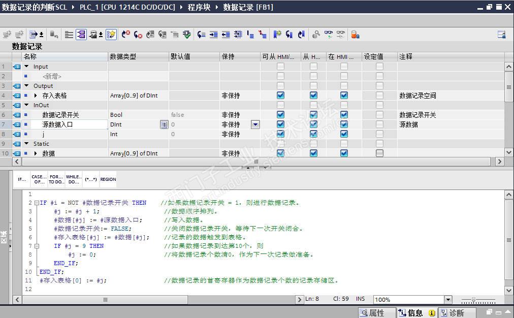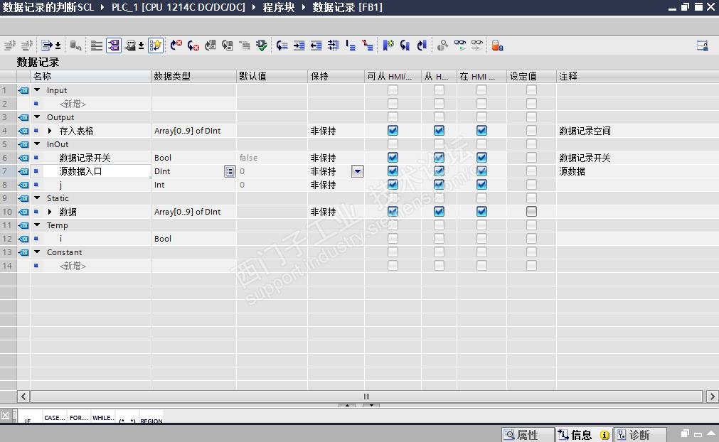 SCL编程-----数据记录 随着编程语言SCL的逐步普及和推广,越来越多的编程者会熟悉SCL编程方式,应用掌握SCL编程语言方式,其强大的运算能力,被得到用户的认可。 虚拟的工作场景: 创建一个数据记录功能项目,将数据记录通过一个外部的数据记录开关,将需要记录的数据逐个记录到数据块各存储地址中,假设数据记录的长度为10个数据长度,实际上用户需要多大的数据记录空间,也仅仅只是在SCL编程中,规范一下数据记录的长度而已,为方便说明这里暂定10个DINT数据,图示:利用数组创建Array[0…9] of DINT,在DB2中创建,并取消优化访问,方便观看数据记录在存储区的地址转移记录过程。 创建数据记录接口,FB1图示: 编辑SCL数据记录程序,图示: 数据记录程序理解起来也非常简单,程序解释: 当数据记录开关 = 1,进行数据记录的操作,满足了IF条件判断,则程序自此处开始运行,一直到END_IF为止的所有程序段内容。首先,数据记录顺序排列J = 0 + 1,结果J = 1,而源数据侧有一个100的数据待记录,将准备从“源数据入口”进入数据记录的表格中,那么,源数据入口100的数据,被记录到数据[#j]中,数据记录的程序有OB1调用FB1,填写实参后,相当于DB2.DBD40的数据,被写入到DB2.DBD4中,结果DB2.DBD4 = 100,程序继续运行到FALSE写入数据记录开关值,关闭数据记录开关是为了接通开关只记录一次,然后将记录的数据传送到数据记录的表格,以便下一次的数据记录存放存储区,作为中间传递。这样完成一次完整的接通数据记录,开关开到关只能记录一次,直到数据记录开关的接通累加次数为9时,清除这个累加的数据,以便下一个10次的数据记录做准备。用户如果需要记录100个数据,只需要将DB2扩充相应的数据记录区域外,在此处改为,程序: IF #j = 99 THEN //如果数据记录到达第100个,则 #j := 0; 就能够满足数据记录的表格长度需要。 第一次的数据记录,图示: M0.0作为验证程序的内部变量,添加到FB1的外部接口中,实现程序的模拟仿真。 当M0.0 = 1,第一次接通后,DB2,DBD0 = 1(第一个数据记录),DB2.DBD4 = 100;将源数据修改为200后,再次接通M0.0 = 1,程序运行结果图示: 程序运行的结果是,DB2.DBD4 = 100存放第一次数据,DB2.DBD8 = 200存放第二次数据,同时,数据记录次数寄存器DB2.DBD0 = 2显示已经记录的数据为第2次的数据记录,以此类推,直到DB2.DBD36被存放到源自DB2.DBD40的数据为止,结束一个完整的数据记录。 SCL程序源码: IF #i = NOT #数据记录开关 THEN //如果数据记录开关 = 1,则进行数据记录。 #j := #j + 1; //数据顺序排列。 #数据[#j] := #源数据入口; //写入数据。 #数据记录开关:= FALSE; //关闭数据记录开关,等待下一次开关闭合。 #存入表格[#j] := #数据[#j]; //记录的数据触发到表格。 IF #j = 9 THEN //如果数据记录到达第10个,则 #j := 0; //将数据记录个数清0,作为下一次记录做准备。 END_IF; END_IF; #存入表格[0] := #j; //数据记录的首寄存器作为数据记录个数的记录存储区。 程序附件: |