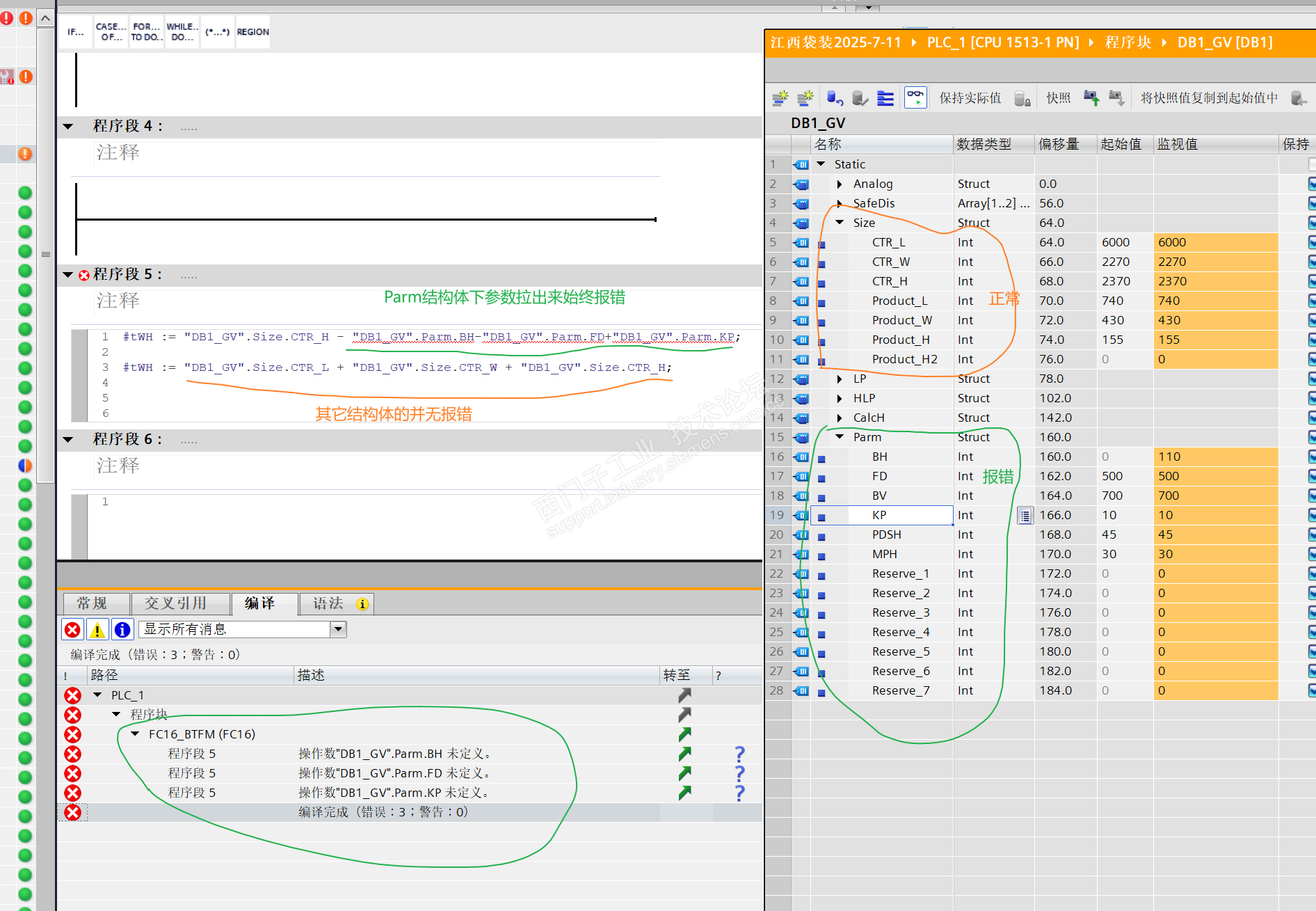 全局DB里面定义的参数,不同分类参数用不同结构体区别,其它结构体下的变量都能用,唯独这个“?Parm?”下的参数用不了,一用就报“操作数未定义”,但是放到功能块的输入接口上又能正常使用。软件重建等方法都试过,直接拖出来用始终编译报错,不知道为什么