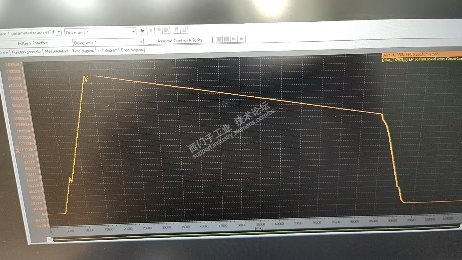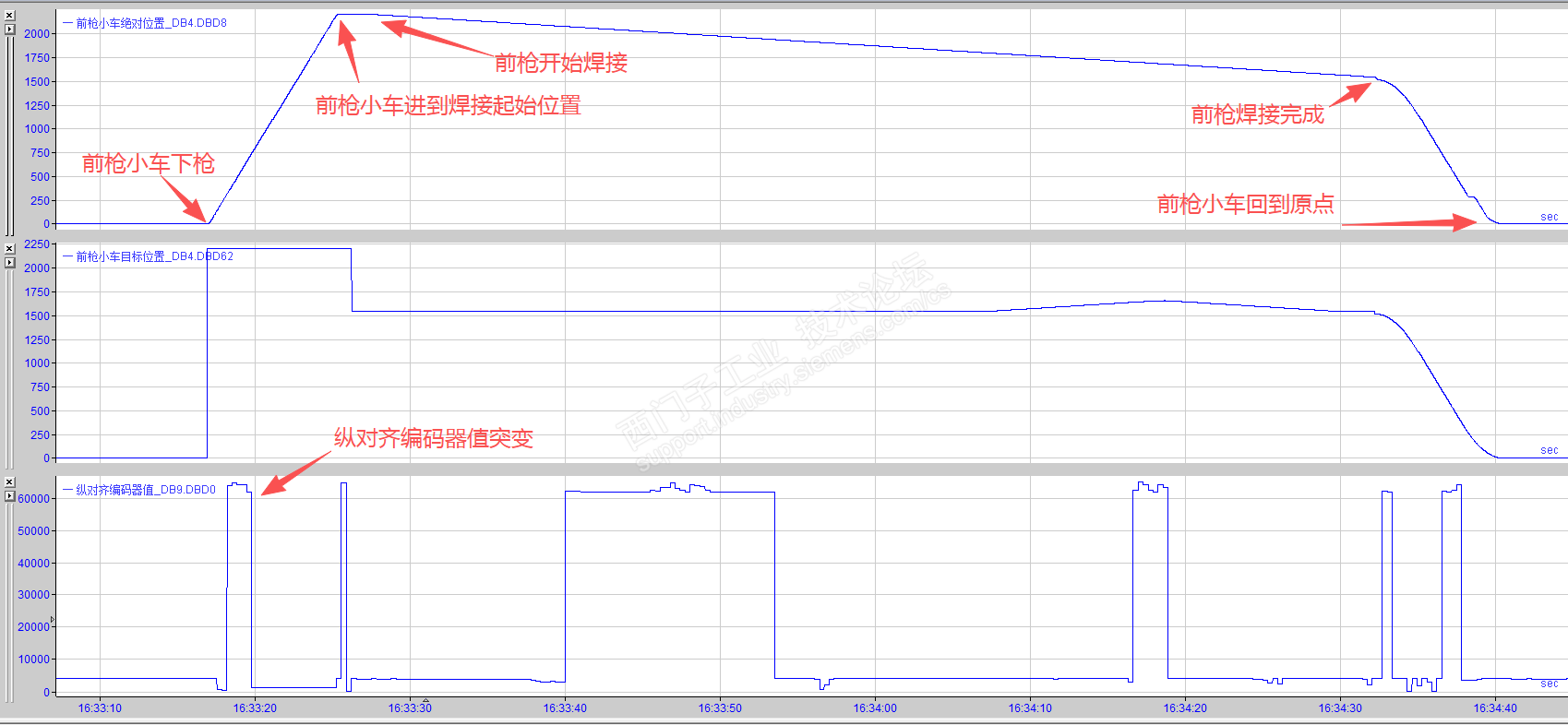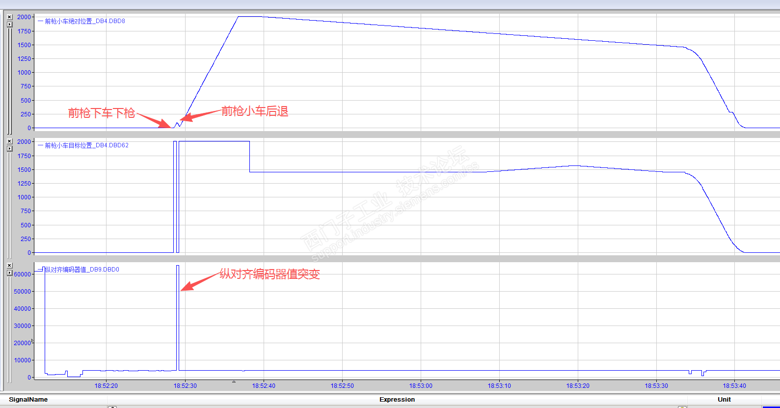 主题:回复:电机运行时会突然反转这个电机跟踪了好久,终于找到问题,一开始用STARTER的录播功能,发现电机的设定值和实际值是一致的,电机没问题,这个电机差不多四十分钟用一次,每次使用不到一分钟,故障有时偶发的,有时一天都不会出线一次故障,后来用ibaPDA软件跟踪了和这个电机定位有关的PLC参数,发现有个编码器(位移传感器)有点问题,这个型号有时会突变,从正常的3~5千的数值会突变到6万,当数值突变刚好发生在PLC计算电机目标值的时候,就发生电机反转了。找到问题就好办了,找设备厂家,暂时把这个参与定位计算的数值屏蔽掉,不影响使用,等买到了备件再恢复,德国货,货期好几周。 |