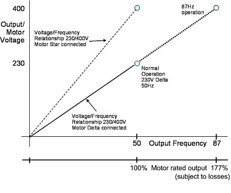 根据所观测到的数据,可以判断变频器对三角形接法,额定电压220V的这种定制电机可以输出高出额定电压的电压,已保持87HZ至50HZ输出恒定转矩。