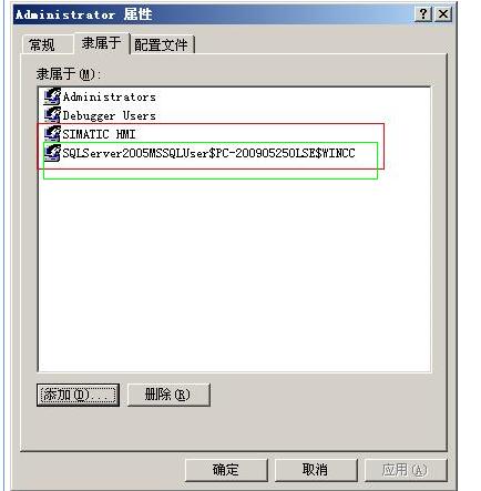 参照dcount107所说的。我在计算机里将STMATIC HMI.添加的我的账户下后。发现,在我的电脑上,无法将下图中绿色框内“SQLServer2005SQLUser$计算机名$WinCC”添加进去。如图: 一开始我以为无法添加“SQLSever”会影响问题的解决。后经过证实只需要添加“STMATIC HMI”重启计算机(必须重启,否则无效果)。 问题解决。 |