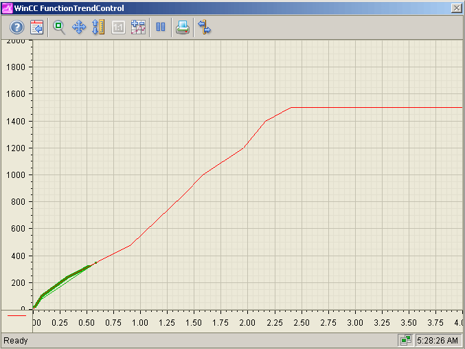 1. 在Step7中 在Step7中建立一个SSP功能块,其定义如下: 1.1. 功能块的输入: 1.1.1. PV信号,就是我们需要控制的参数,Real。 1.1.2. x1,x2,x3...x10输入信号,代表时间间隔的参数,real。 1.1.3. y1,y2,y3...y10输入信号,代表输出值的参数,real。 由(x1,y1),(x2,y2)......(x10,y10)共计10点,组成折线表。 1.1.4. Start输入信号,控制SSP运行的信号,off:停止,on:运行。bool。 1.2. 功能块的输出信号 1.2.1. SSP输出,当Start=off时,SSP=PV。当Start=on时,SSP以当前的PV为初始值,由(x(n),y(n))和(x(n+1),y(n+1))组成的直线来决定SSP的值。real。 1.2.2. ElapseTime,代表SSP运行的时间,real。 1.3. 主要功能说明 1.3.1. Start=off,SSP=PV,ElapseTime=0。 1.3.2. Start从off→on的正跳变时,功能块要根据此时的PV值(计作y0),反向计算出对应的X值(计作xo)。主要是考虑无扰动切换。 1.3.3. Start=on,从x0开始,计算x值,并通过直线方程得到SSP值。 1.3.4. Start=on,ElapseTime=ElapseTime+OB35的时间。 2. 在WinCC中 2.1. 在WinCC中建立一个User Archive(名称为yhg),并建立X、Y两个字段(Field)。 2.2. 在TagLogging中,为Step7中的SSP功能块的输出SSP信号(也可以选择实际需要控制的参数作为归档信号)和ElapseTime信号建立归档记录。 2.3. 在图形中建立一个UserArchive 控件,在控件组态中指定UserArchive名称为yhg。 2.4. 在图形中建立一个FunctionTrend控件,在控件组态中建立2个变量:UserArchiveSSP和SSP。 a) UserArchiveSSP的数据源选择UserArchive/yhg,其X轴选择UserArchive中的yhg文件的x字段,Y轴选择UserArchive中的yhg的y字段。 b) SSP的数据源选择ArchiveTags,其X轴选择TagLogging中的ElapseTime,Y轴选择TagLogging中的SSP。 2.5. 在图形中增加一个按钮对象,名称为“Download to PLC”,并在鼠标事件中定义如下s cript: #include "apdefap.h" void OnLButtonUp(char* lpszPictureName, char* lpszObjectName, char* lpszPropertyName, UINT nFlags, int x, int y) { #include "apdefap.h" void UAReadFromArchive(); UAHCONNECT hConnect; UAHARCHIVE hArchive; LONG lField = 1; LONG NumberOfFields; int ID; int FieldIndex; int plCount; float x_Axis[15]; float y_Axis[15]; float pfValue; //******* Connect to Componente User Archive ********************** if(uaConnect(&hConnect)==FALSE) { printf("uaConnect error: %d\r\n",uaGetLastError()); return; } if(hConnect==NULL) { printf("Handle UAHCONNECT equals NULL\r\n"); return; } //******* Connect to Archive via Name ****************************** if(uaQueryArchiveByName(hConnect,"yhg",&hArchive)==FALSE) { printf("uaQueryArchive Error: %d\r\n",uaGetLastError()); uaDisconnect(hConnect); return; } //********* Sort on the ID ****************************************** uaArchiveSetSort( hArchive, "ID" ); //******* Opens Archivs ******************************************** if(uaArchiveOpen(hArchive)==FALSE) { printf("uaArchive Open Error\r\n",uaGetLastError()); uaReleaseArchive(hArchive); uaDisconnect(hConnect); return; } //******* Get Number of ********************************************* NumberOfFields = uaArchiveGetFields( hArchive ); printf( "Number of Fields = %u\n", NumberOfFields ); //******************************************************************* UAArchiveGetCount(hArchive,&plCount); printf( "Number of data records: %d\r\n" , plCount); uaArchiveMoveFirst(hArchive); //Return-Type: BOOL for (FieldIndex = 1; FieldIndex < NumberOfFields; FieldIndex++) { uaArchiveMoveFirst(hArchive); //Return-Type: BOOL for (ID=1; ID <= plCount; ID++) { if (uaArchiveGetFieldValueFloat(hArchive,lField,&pfValue)) //Return-Type: BOOL { if (lField==1) { x_Axis[ID] = pfValue; printf( " x Value: %f\r\n" , x_Axis[ID]); } else { y_Axis[ID] = pfValue; printf( " y Value: %f\r\n" , y_Axis[ID]); } uaArchiveMoveNext(hArchive); //Return-Type: BOOL } else { printf("Error:%d\n", uaGetLastError() ); break; } printf( " ID: %d\r\n" , ID); } lField++; } //******* Close Archive ******************************************** if(uaArchiveClose(hArchive)==FALSE) { printf("error on closing archive\r\n",uaGetLastError()); } if(uaReleaseArchive(hArchive)==FALSE) { printf("error release archive\r\n",uaGetLastError()); } //******* Disconnect Component User Archive ************************ if(uaDisconnect(hConnect)==FALSE) { printf("error on disconnection\n",uaGetLastError()); } //******* Write to PLC ************************************** SetTagFloatWait("S7$Program(1)/CFC(1)/SSP.x1",x_Axis[1]); //Return-Type: BOOL //...... SetTagFloatWait("S7$Program(1)/CFC(1)/SSP.x10",x_Axis[10]); //Return-Type: BOOL SetTagFloatWait("S7$Program(1)/CFC(1)/SSP.y1",y_Axis[1]); //Return-Type: BOOL //...... SetTagFloatWait("S7$Program(1)/CFC(1)/SSP.y10",y_Axis[10]); //Return-Type: BOOL } 2.6. 在图形中增加一个按钮对象,名称为“Start”,并在鼠标事件中定义如下s cript: #include "apdefap.h" void OnLButtonDown(char* lpszPictureName, char* lpszObjectName, char* lpszPropertyName, UINT nFlags, int x, int y) { if (GetTagBit("S7$Program(1)/CFC(1)/SSP.Start")) //Return-Type: BOOL (SetTagBitWait("S7$Program(1)/CFC(1)/SSP.Start",FALSE)); //Return-Type: BOOL else (SetTagBitWait("S7$Program(1)/CFC(1)/SSP.Start",TRUE)); //Return-Type: BOOL } 2.7. 测试 2.7.1. 在PLC或PLCSIM中运行Step7程序。 2.7.2. 运行WinCC,在UserArchive 控件输入相应的X、Y值,检查无误后,按“Download to PLC”按钮,将输入的X、Y值下载到PLC的SSP功能块的相应输入端子。 2.7.3. 在WinCC中按“Start”按钮,启动Step7中的SSP功能块。 2.7.4. 可以看到在WinCC中的FunctionTrend有2条曲线: a) 一条是UserArchive的曲线,这是我们希望得到的曲线,该曲线不随时间变化 b) 另一条是实际的曲线,该曲线是随时间变化的。 其他的功能可以根据需要增加。 附效果图: ![]() |