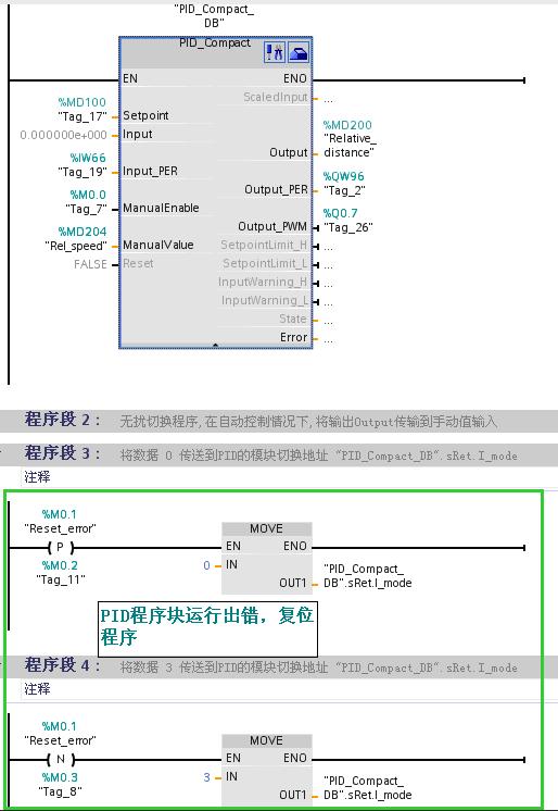 话说,2010年10月中旬,用户在调试供暖系统时,非常着急的现场咨询S7-1200 PID自整定的相关问题,原来是因为此套系统要赶在供暖前调试成功并正常运行。刚刚咨询用户使用时出现的问题时,听的我满头雾水,“输入值不等于输出值”,逐一的和用户确认排除,终于,终于,历经整整两天,在用户的积极配合下,及时的解决了问题,确保了供暖系统的正常运行。当时心里小开心了下,毕竟供暖是大事么! 言归正传,现在,我再把用户使用过程中遇到的问题做下汇总,和大家一起分享下,希望能帮助更多有需要的人。 客户问题1:客户使用S7-1200 PID程序块,使用的反馈值是 INPUT ,启动自整定后出现输入值超出设定范围错误,无法启动自整定功能。 解答: 经过与用户多次交流,发现问题是存储器地址冲突: 客户使用了INPUT输入变量,经过模拟量输入处理程序标定上限为:100.0,下限为:0.0。分配的存储地址是MD516,在客户的程序内容还使用了MW516 ,MD518地址。导致地址冲突,修改MD516数据,使MD516存储器保存的数据大于100.0,当启动自整定时,出现输入值超出设定范围错误。 扩展知识 1. MD516 包括4个字节: MB516 ,MB517,MB518,MB519,当使用MD516寄存器,其他程序不能使用MB516,MB517,BM518,MB519。否则,导致地址冲突,保存数据被修改或丢失。在S7-200的M区和V区;S7-300/S7-400的M区都需要注意此问题。 2. S7-1200 PID的两个反馈数据 INPUT/INPUT-PER区别,以及与Setpoint的关系。 INPUT是现场仪表测量数据,经过程序标定转换成实际工程量数据。数据类型是实数。 INPU-PER是现场仪表数据直接经过模拟量通道进行测试,未进行数据标定,数据类型是WORD。可以通过PID组态直接进行数据标定,转换成实际工程量。推荐使用此方法。 Setpoint:设定值,PID系统通过调解输出设备,使反馈值与设定值相等。设置范围即是反馈值标定的上下限。 3. Output,Output_PER, Output-PWM区别, 这三个信号全是输出信号,Output与Output_Per是一组, Output输出是一个百分比数,即0%~100%,指控制设备全关或全开。 Output_Per直接输出至模拟量通道,输出整数0~27648 Output_Pwm输出是脉宽信号,开关量输出,与上面两个信号不相同,单独使用。 建议的组态过程: 如图1 程序块 图1 如图2 基本参数配置 反馈与输出配置 图2 如图3 反馈数据标定 图3 客户问题2:如何启动S7-1200的自整定,客户的设定值与反馈值过于接近,无法使用“启动自整定” 解答: 当您的系统各部分已经准备完毕,可以使用自整定,自整定功能只是系统将自动优化或计算PID参数,是调试的一种方法,正常运行时,不必运行自整定调试程序。 方法如下: 第一步:启动测试 图4 第二步:设定值设定 首次启动自调节: 建议第一次自整定时,一定要使用“启动首次自整定”,可以避免系统出现发散现象,无法正常工作 设定值要求: 设定值 – 反馈值(已标定) > 0.3 * 反馈值上限 – 反馈值下限制 和 设定值 – 反馈值(已标定) > 0.5 * 设定值 运行自整定:微调,校验PID参数,在完成首次自整定后,建议启动运行自整定,对PID参数进行再次检验。 设定值要求: 设定值 – 反馈值(已标定) <0.3 * 反馈值上限 – 反馈值下限制 和 设定值 – 反馈值(已标定) < 0.5 * 设定值 第三步 启动自整定,见图5 图5 第4步 完成状态 图6 以上就是用户在现场实际情况中遇到的两个问题,不过,对PID来讲,我又做了如下的问题的扩展,希望对大家有进一步的帮助。 问题:S7-1200 PID正常运行的情况下,出现错误,如何恢复。 解答: 在程序块 PID_Compact内,管角Error=1时,指示当前PID运行状态出错。要重新启动PID功能,需要修改PID模式-PID_CompactDB.sRet.i_Mode。来恢复PID运行,在复位PID之前,需要确认错误已经消除。其他方法无法重新启动PID,包括Reset功能也不能重置。 具体程序如图7 图7 暂做以上总结,,欢迎大家补充更多容易遇到的问题。最后祝大家身体健康,工作顺利。 |