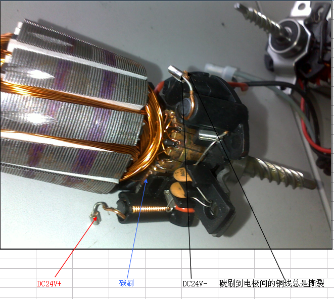设备上有一单相直流电机,DC24V供电,驱动一个丝杆做伸缩运动(与气缸的动作类似)在伸到位时,有限位保护,缩到位没有。现主要的问题是电极到碳刷的铜线老师断裂,是撕裂,不是烧断或磨断的,对此向大家寻求帮助 ![]()