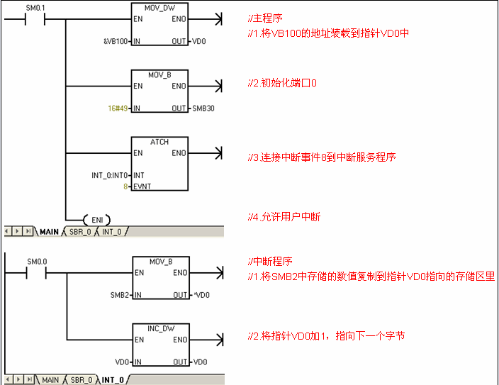 常问问题一:字符中断是什么? 通过阅读系统手册,我们知道使用字符中断方式接收数据,接收每个字符时都会产生中断。在执行与接收字符事件相连的中断程序前,接收的字符存入SMB2寄存器中,校验状态存入SM3.0。 SMB2、SM3.0都是只读的。Port0/Port1共用SMB2/SMB3。Port0对应于中断事件8。Port1对应于中断事件25。 常问问题二:字符中断怎么用? 以端口0接收字符为例: ![]() 当CPU通过端口0接收到一个字符后,会将该字符存入接收字符缓冲区SMB2,然后进入相连接的中断程序中。 注意,对于这段程序,如果在中断程序中不作任何编程,那么当CPU接收n个字符时,中断程序将被执行n次,SMB2寄存器存储接收到的最后一个字符。如上位机通过串口调试软件给CPU发送3个字符16#AA、16#BB和16#CC, ![]() 那么与接收字符事件相连的中断程序将被执行3次,SMB2中只能保存最后一个接收到的字符16#CC。 ![]() 常问问题三:用SMB接收多个字符,如何编程? 由于SMB2只能存储一个字符(一个字节),如果要想接受多个字符,则应当在CPU接收下一个字符之前,在中断程序中通过指针编程将SMB2中存储的字符移出来,以便下一次接收字符。以一个例程说明: ![]() VD0作为地址指针指向VB100,当端口0接收到第一个字符,将第一个字符存入SMB2,进入接收中断,将SMB2中的字符复制到指针VD0指向的地址字节VB100中,指针地址加1,VD0指向下一个字节VB101。当接收第二个字符,将字符存入SMB2,进入接收中断,将SMB2中的第二个字符复制到指针VD0指向的地址字节VB101中,指针地址加1,VD0指向下一个字节VB102。当接收第三个字符时以此类推。 另外,如果需要接收n个字符就结束接收,或者需要接收n个字符后循环接收,可以在中断程序中设置一个标志位,下面我们试举例说明: 例程1,接收到5个字符就结束接收的程序: ![]() 例程2,接收到5个字符后循环接收的程序: ![]() 最后要提醒您注意的是,程序中的的指针不要选择累加器AC,因为累加器不能在主程序和中断程序中传递参数。 常问问题四:字符中断和RCV指令之间有什么关系? 简单地说,当RCV指令使能时,接收字符不进入SMB缓冲区。 我们可以设计个实验分析一下: 在主程序中我们既定义PLC执行RCV接收指令的起始结束条件(起始条件为起始字符16#AA,结束条件为结束字符16#BB),又建立字符中断事件8,上升沿条件触发RCV指令。 上位机通过串口调试软件给CPU发送字符。 ![]() 程序如下图: ![]() 状态表监控结果: ![]() 结论: 当RCV指令不触发的话,接收字符只进入SMB2缓冲区,不进入RCV指令的接收缓冲区。 当RCV指令触发后,满足CPU接收的起始和结束条件的字符存入RCV指令对应的TBL缓冲区。起始条件之前的字符既不存入RCV缓冲区,也不存入SMB2缓冲区。结束条件之后接收到的字符,存入SMB2缓冲区。 通过以上几个问题的分析,我们对于字符中断和SMB2的基本用法和特点做了介绍,相信在实际项目中会有更多灵活的应用等待我们去发掘。 LDT |
