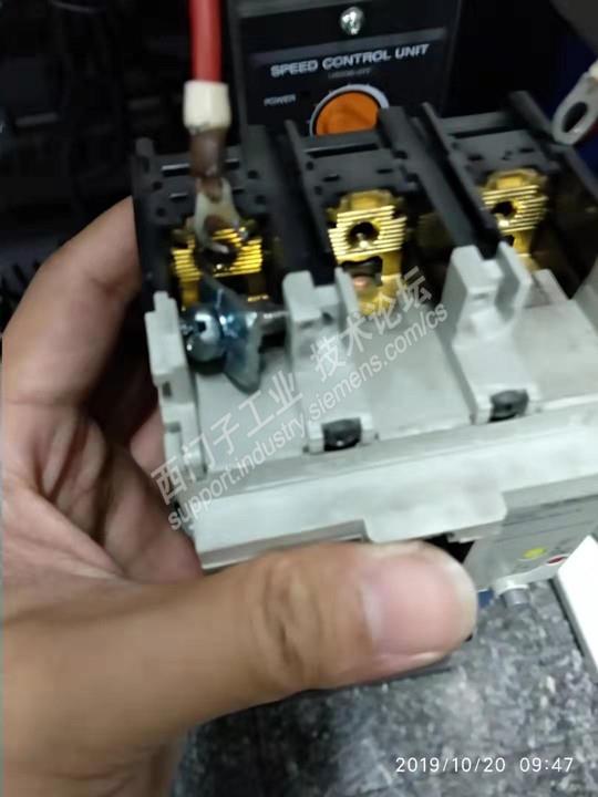 主题:断路器接触不良引起的设备故障 前几天上班被告知设备无法运行,一到设备旁,触摸屏无显示,打开电柜电源运行的绿灯,PLC机架所以的等一闪一灭,首先想到的是开关电源可能有问题了,拆下开关电源(该设备加工中可能有小块金属,没做好密封的电柜可能有异物进入),拆开开关电源外壳,里面有点金属异物,清理异物,接线试开关电源,电源正常,以为这样就维修完成了 装上设备后,现象还是依旧,拆下开关电源的输出端,开关电源还是闪烁,想着是前端出问题了,一步一步检查到了进线断路器,如下图,长时间的接触不良导致接线端子烧坏损坏