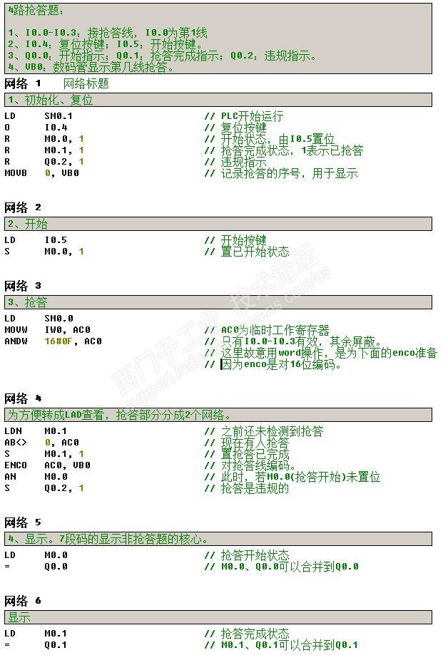 主题:回复:谢谢大家的关注 抢答原贴已关闭。本人把楼主的题目做一下。未经实物验证。 本人认为,编程,思维比写代码重要。 1、主持者的按开始后抢答才有效,所以要有一个变量记忆开始状态; 程序用STL写成,比较象电脑程序。按LAD规则分网络,所以可以转成LAD查看。