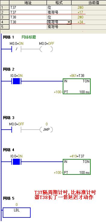以下图片中的程序测试100毫秒分辨率定时器T37的运行,时序图表明在有意把I0.0接通的第一个扫描周期用循环指令把扫描周期拉长到200毫秒后它仍能准确计时,这个和OMRON CPM1A是完全不同的.