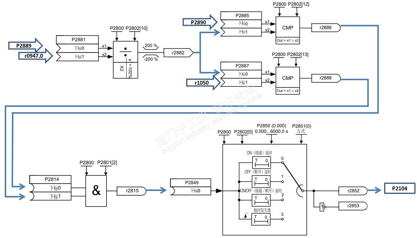 这里还有两点需要说明:第一,比较值150%来源于r1050的内部值,即参考频率为50Hz、r1050=75Hz时,r1050的内部值为150%。第二,F3欠压故障的位信号在连接参数p2014故障复位之前,增加了一个300ms的上升沿延时,防止短时间内连续欠压故障时不能自动复位的情况出现。