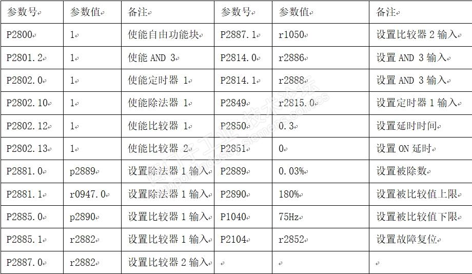 那么具体怎么实现呢?故障发生时,参数r0947会记录变频器当前的故障代码,而这个故障代码除了用于我们做诊断故障,还可以做运算。不过,在内部运算时r0947是等于 的,有了这个特定的值,再加上自由功能块中的“比较器”和“与逻辑”就可以得到一个特定故障的状态位信号(可以用于特定故障的故障复位)。