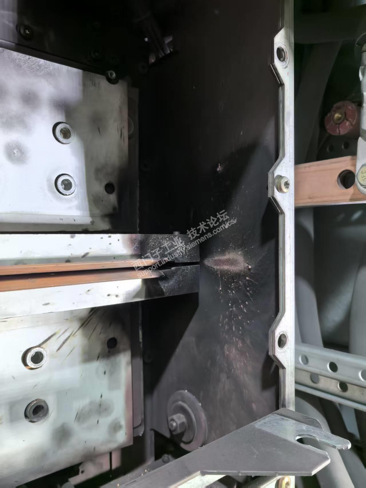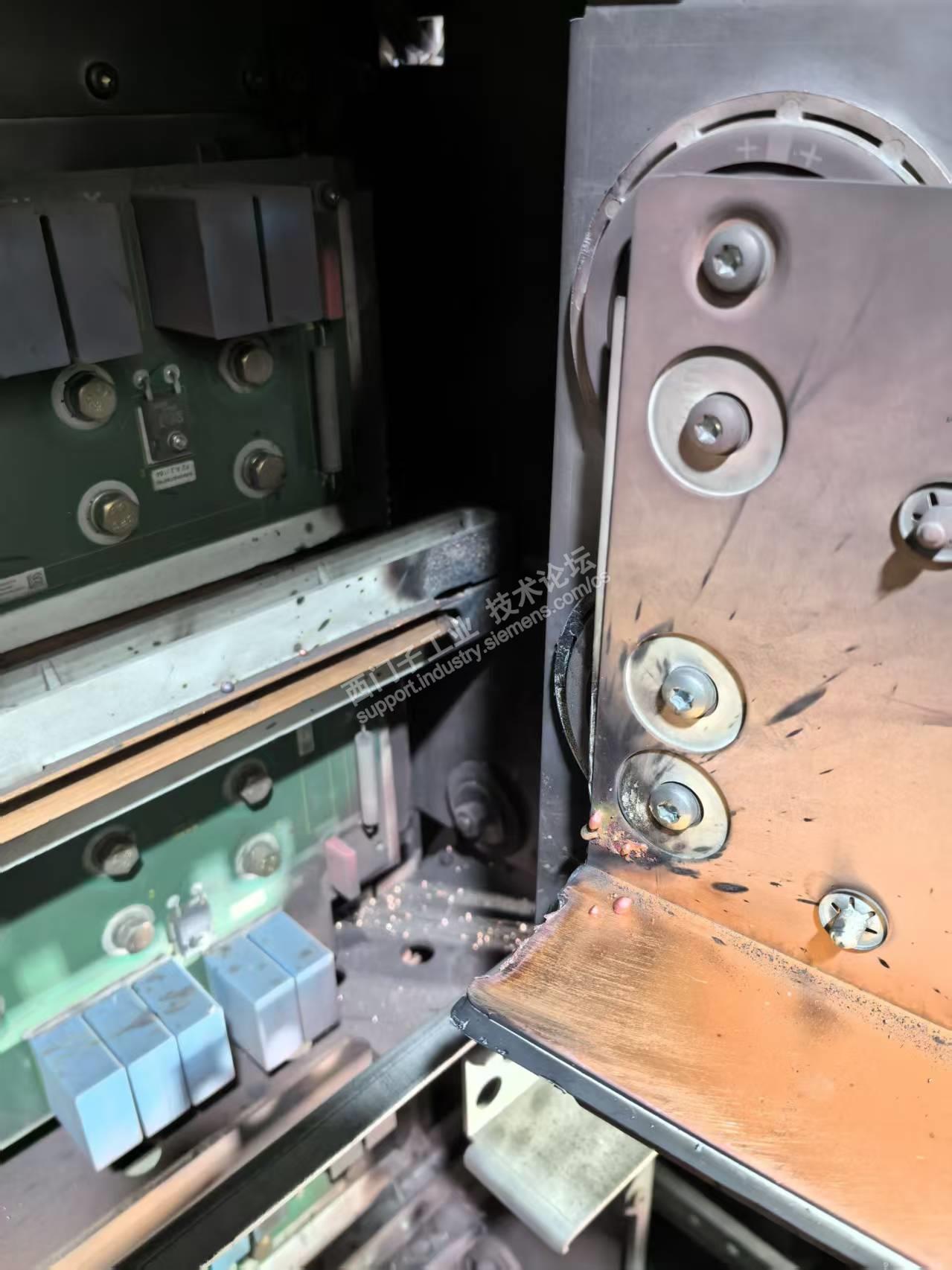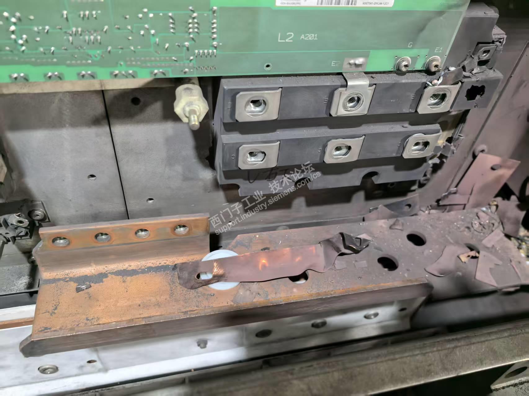 故障处理过程:人员到达现场后检查6000V进线,590V变频器进线均正常。检查进线快速熔断器、Q10开关的快熔,检查从AFE柜快熔后端各逆变器快熔,检查从AFE柜的IGBT的二极管特性。均正常,检查预充电电路中K4预充电接触器,预充电电阻、变频器控制电电源,K1、K2、K3主接触器。预充电电阻,滤波回路的电容和电阻,均正常。考虑到是先报的F008所以检查了一下滤波回路的K7、K10接触器,通过短接CUSA的X101的6-7端子联动无异常,考虑到在滤波回路中串了VSB板X3的1-5用于电网角度检测,所以把从滤波柜中的VSB和主的经行对调,用以排查故障。至此,AFE前端电路检查完毕。启动设备经行试验,再次报F002并发现K10、K7接触器并未吸合,于是再次排查从AFE柜内电路板,先后更换VDU、PSU、IVI、CUSA,检查柜内电压检测回路线束无异常。将AFE经行单托启动,主AFE启动后一切正常,直流母线电压984V,电流54A,各部接触器吸合顺畅。当启动从AFE后,K4吸合后预充电电抗器声音低沉,并且在2S后K7没有吸合,这时意识到不对,想去停机,没想到这是一顿电光火石,柜子炸了。上图。