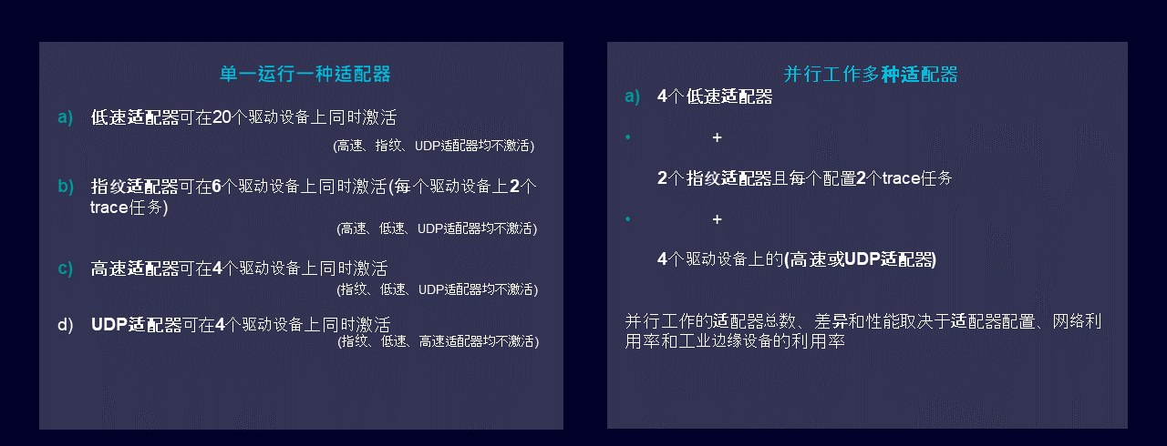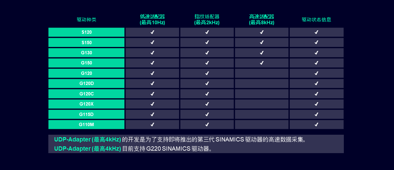 Drive Connector SINAMICS(DC SINAMICS)搭建SINAMICS驱动数据到工业边缘设备的数据通道。为了满足不同场景下的数据传输需求,该边缘应用提供了四种不同速率的适配器:低速适配器(10Hz)、指纹适配器(2kHz)、高速适配器(8kHz),以及UDP适配器(4kHz)。其中,前三种适配器均是为第二代SINAMICS驱动器量身打造,如SINAMICS G系列以及基于CU320-2的驱动器。而UDP适配器则专为第三代SINAMICS驱动器设计,目前已全面兼容SINAMICS G220高性能变频器系列。
