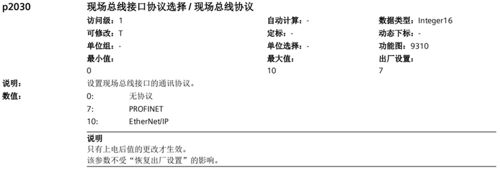 4. 检查变频器参数p2030(现场总线接口协议选择),如果该参数不是7,需要设置成7,并断电再上电变频器才能生效。