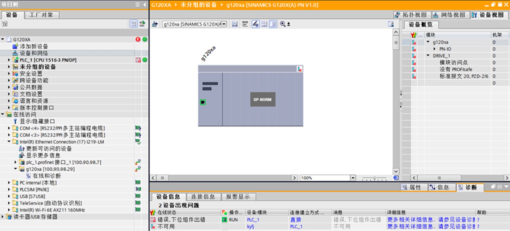 变频器G120XA通过BOP面板调试可以正常运行,在TIA Portal中通过GSDML文件组态后与PLC通讯连接异常,且TIA Portal在线后驱动显示✖,诊断状态提示“不可用”。