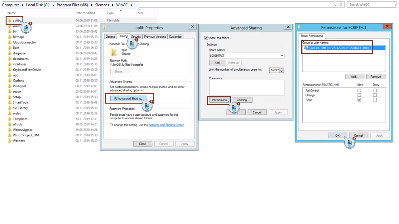 一个可能的原因是 “aplib” 文件夹的权限在 WinCC V7 服务器上没有设置正确。“aplib” 文件夹位于“计算机-> System (C:) -> Program Files (x86) -> Siemens -> WinCC ”。
