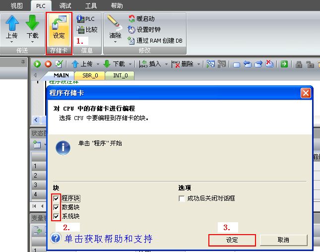 在 Micro/WIN SMART 中,点击“PLC”->“存储卡设定” ,打开“程序存储卡”对话框,选择需要被拷贝到存储卡上的块(程序块、系统块、数据块),点击“编程”设定,如图2所示;