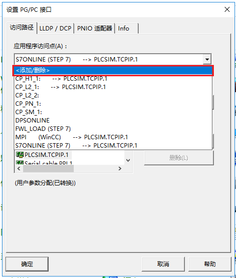 打开电脑的“控制面板”,找到“设置 PG/PC 接口”,双击打开设置界面,选中”添加/删除“。