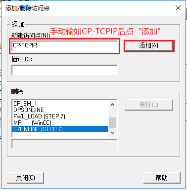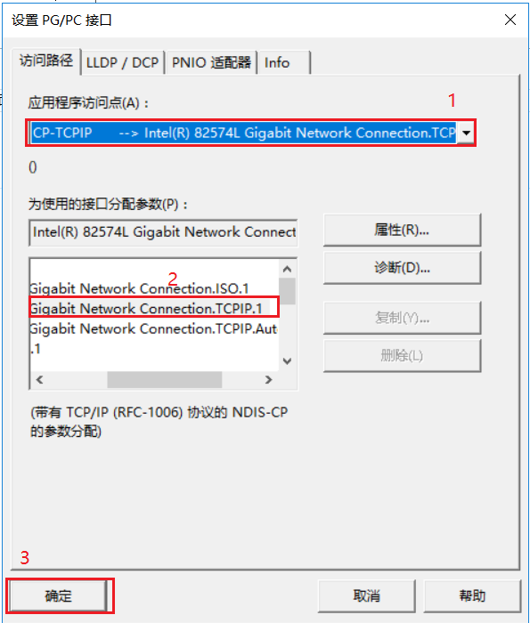 选中访问点“CP-TCPIP”,并为使用的接口分配参数, “CP-TCPIP ”对应连接 300 PLC的网卡。