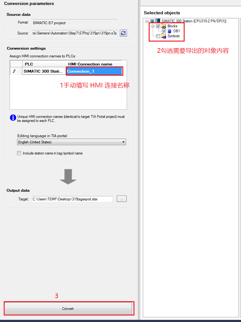 手动填写 HMI Connection Name(注:不建议使用中文),并勾选需要导出的对象内容。