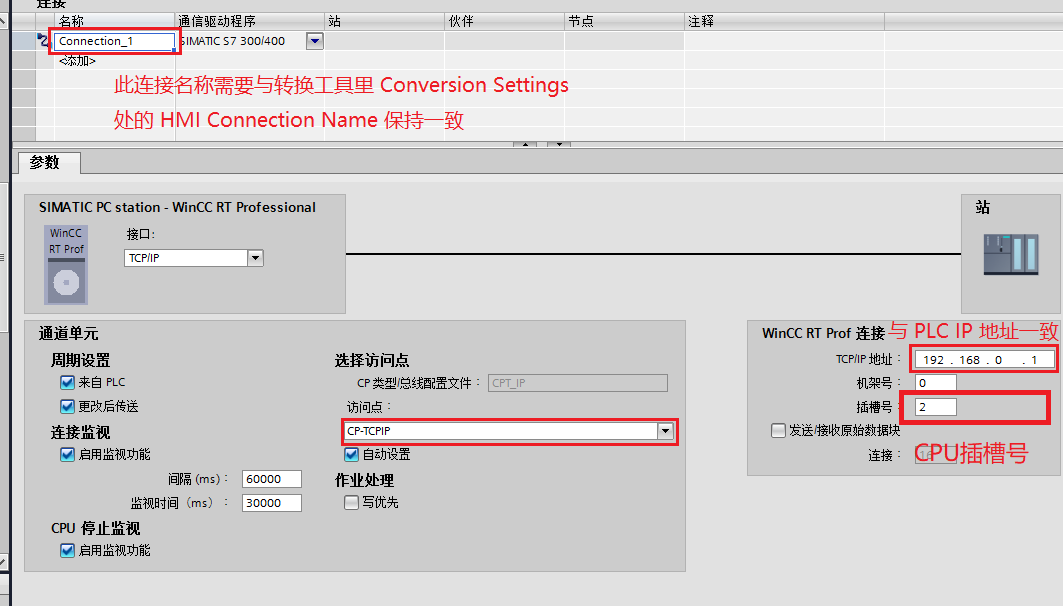 在 WinCC Professional 项目中手动添加 HMI 连接,驱动选择Simatic S7-300/400。连接名称与导出文件一致,IP 地址与300站一致,插槽号填2,机架号为0,访问点使用默认的 CP-TCPIP。