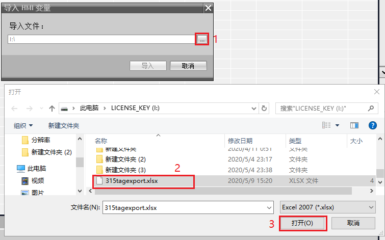 在“导入 HMI 变量”对话框中选中通过 TagConvert 工具导出的 Excel 文件,并点“打开”。