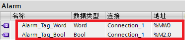 1.在变量表中创建一个Word类型和一个Bool类型的外部变量用于离散量报警触发。地址分别为MW0 M2.0 如下图所示: