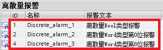2.在 "项目树>HMI报警>离散量报警" 中添加3条报警。在报警文本列写入自定义报警文本。