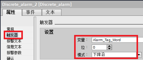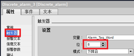 第三条报警 "属性" 的触发变量关联变量表中的 Word 类型变量,触发位8。模式选择下降沿。
