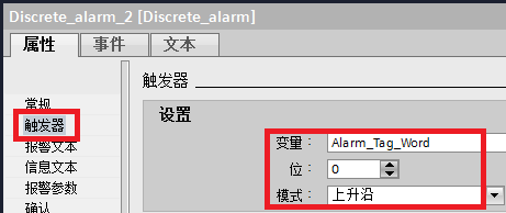 4.第二条报警 "属性" 的触发变量关联变量表中的 Word 类型变量,触发位 0。模式选择保持默认(上升沿)。