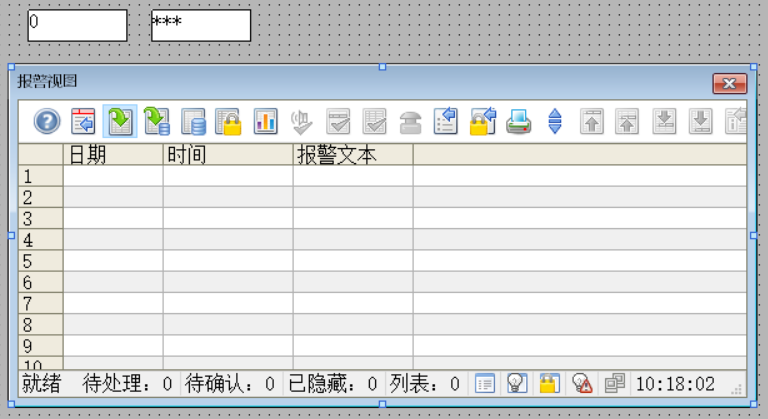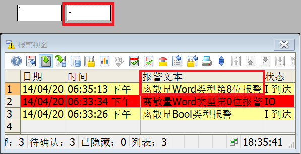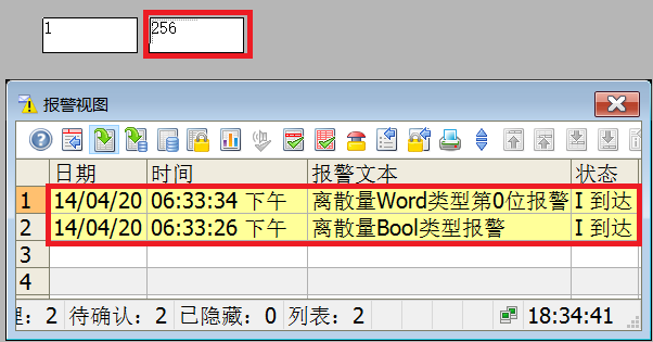 7.运行组态好的项目,对Bool类型变量置 1,Word 变量赋值 256(00000001 00000000),触发结果如下图,Bool 触发了对应报警,Word 变量触发了第 0 位报警。如果是下降沿触发,那么触发位仅在由 1 变为 0 时触发报警。报警触发后显示在报警视图控件中。