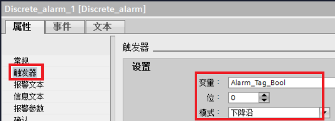 3.第一条报警 "属性" 的触发变量关联变量表中的 Bool 类型变量。模式选择保持默认(上升沿)。