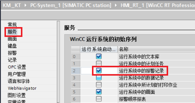 6.在 "运行系统设置>服务" 中,勾选 "运行系统中的报警记录"。