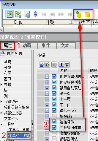 在“报警视图”控件属性窗口中,依次选择“属性>工具栏>工具栏-按钮”,然后勾选“连接备份”、“断开备份连接”按钮。然后在 WinCC 运行系统中,通过点击控件工具栏上的这两个按钮,就可以连接或者断开备份的归档文件了。