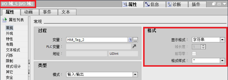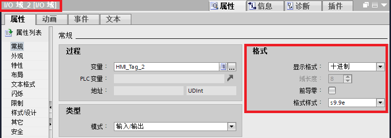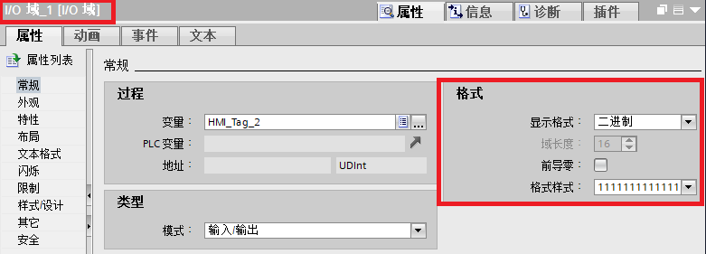 6.在“画面_1”上添加5个“I/O域”关联同一个无符号32位变量“HMI_Tag_2”,用来显示不同数据格式的输出值: