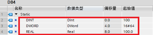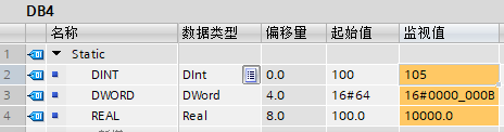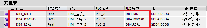2.在WinCC RT PRO的变量表中也同样创建三个变量,如下所示: