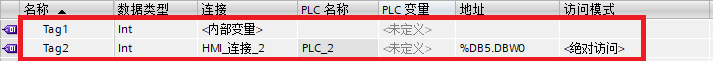 2.在变量表中创建一个内部变量和一个PLC变量,如下所示: