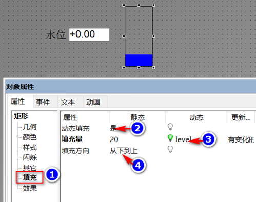 首先在矩形的“填充”(①)属性下,启用“动态填充” (②),为“填充量”动态属性分配变量(③),设置填充方向(④),步骤如下图所示: