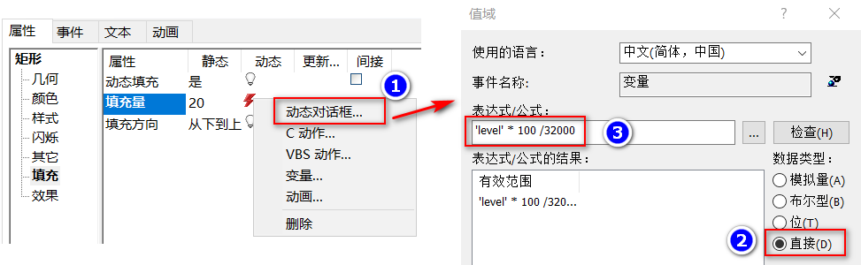 可以为“填充量”动态属性直接分配变量,也可以使用表达式或公式。为“填充量”动态属性选择“动态对话框”(①),然后在弹出的对话框中为“数据类型”选择“直接” (②),然后输入表达式或公式(③)。