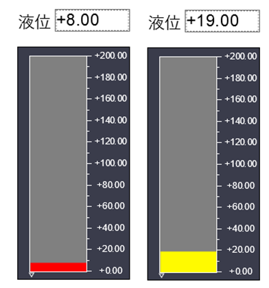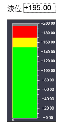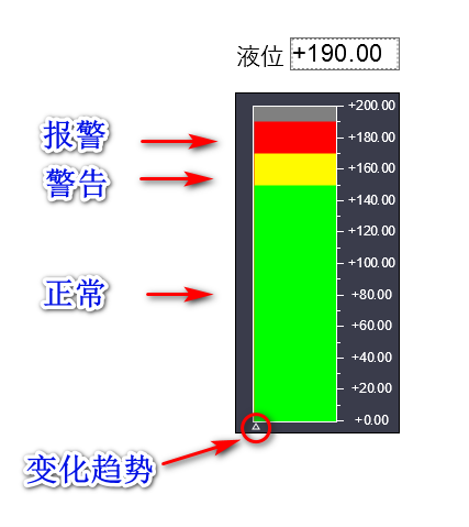 当液位高于设定的XL值时,超出部分的棒图将以对应颜色来显示,例如AH的限制值设置为170,颜色为红色,WH的限制值设置为150,颜色为黄色,那么当所连接的变量数值为195时,棒图将分为三种颜色显示:正常颜色、WH颜色和AH颜色,如下图所示: