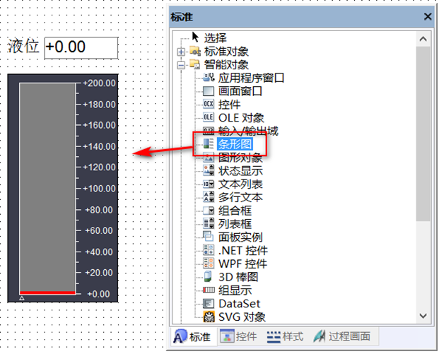 首先,在WinCC智能对象下找到“条形图”并拖拽到画面中,如下图所示: